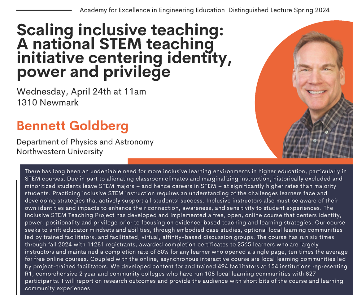 There has long been an undeniable need for more inclusive learning environments in higher education, particularly in STEM courses. Due in part to alienating classroom climates and marginalizing instruction, historically excluded and minoritized students leave STEM majors – and hence careers in STEM – at significantly higher rates than majority students. Practicing inclusive STEM instruction requires an understanding of the challenges learners face and developing strategies that actively support all students’ success. Inclusive instructors also must be aware of their own identities and impacts to enhance their connection, awareness, and sensitivity to student experiences. The Inclusive STEM Teaching Project has developed and implemented a free, open, online course that centers identity, power, positionality and privilege prior to focusing on evidence-based teaching and learning strategies. Our course seeks to shift educator mindsets and abilities, through embodied case studies, optional local learning communities led by trained facilitators, and facilitated, virtual, affinity-based discussion groups. The course has run six times through fall 2024 with 11281 registrants, awarded completion certificates to 2565 learners who are largely instructors and maintained a completion rate of 60% for any learner who opened a single page, ten times the average for free online courses. Coupled with the online, asynchronous interactive course are local learning communities led by project-trained facilitators. We developed content for and trained 494 facilitators at 154 institutions representing R1, comprehensive 2 year and community colleges who have run 108 local learning communities with 827 participants. I will report on research outcomes and provide the audience with short bits of the course and learning community experiences.